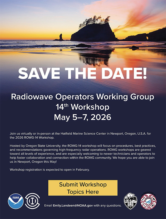 The Radiowave Operators Working Group (ROWG) meeting series sponsored by NOAA’s U.S. IOOS is the only event dedicated to the operations, maintenance, and data output management of HF radar networks. Widely considered the “must-attend” event for those persons operating & maintaining HF radars or working with data outputs, ROWG provides a unique, multi-day opportunity for collaboration on these topics. The next ROWG event is will happen 5-7 May 2026 at the Hatfield Marine Science Center in Newport, Oregon. A virtual component may be available for part of this event.